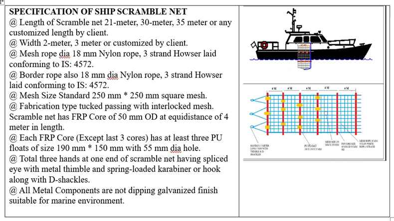 | Product Description | DR SAFETY FIRST NETS make Scramble-net / Rescue-net is designed as rescue-net for offshore sailing yachts, patrol boats, pilot boats and public transport boats. Its main purpose is to enable man overboard to climb on board or to hold to it while other methods are prepared. We generally make these ship scramble nets as per ONGC approved specification. Besides ship scramble nets we also make any customised scramble net as per specific requirements of clients. |